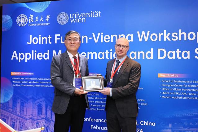 2024年2月26日上午,在tyc1286太陽集團與奧地利維也納大學(xué)戰(zhàn)略合作伙伴框架下,由數(shù)學(xué)科學(xué)學(xué)院主辦的“復(fù)旦-維也納應(yīng)用數(shù)學(xué)和數(shù)據(jù)科學(xué)論壇(Joint Fudan-Vienna Workshop on Applied Mathematics and Data Science)”在光華樓順利開幕。維也納大學(xué)副校長Nikolaus Hautsch、數(shù)學(xué)系主任Radu Bot等共14位奧地利學(xué)者來滬出席論壇。tyc1286太陽集團副校長周磊出席開幕式并致辭,數(shù)學(xué)科學(xué)學(xué)院副院長、中國科學(xué)院院士沈維孝、副院長陸帥、副院長劉建峰、國際合作與交流處處長盧麗安及相關(guān)院系學(xué)者出席開幕式。