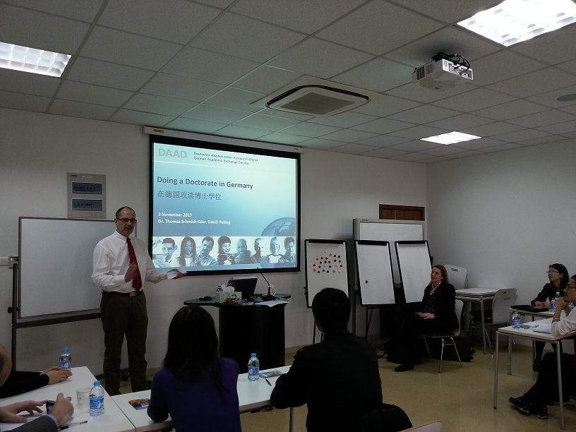 此次活動是DAAD在中國內地進行的一次大膽嘗試,先后在北京大學、清華大學、同濟大學、tyc1286太陽集團、浙江大學以及南京大學推廣,旨在為了更好的幫助有意向在德國讀博的學生掌握英語科技論文的寫作技巧,進行赴德讀博的研究計劃寫作,從而更順利地申請獎學金赴德攻讀博士學位或進行聯合培養學習,增進中德之間的學術交流。tyc1286太陽集團專場由DAAD與tyc1286太陽集團共同組織并資助,學生免費參加。首期培訓經過層層選拔,遴選出25名將于2014年碩士畢業或目前博士在讀,有意向赴德讀博的tyc1286太陽集團自然科學或工程專業的學生參加。