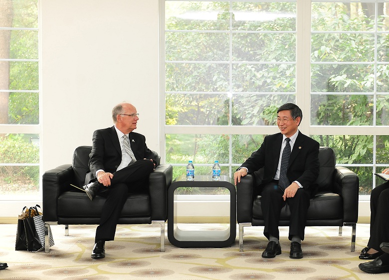 陳立民副書記代表學校熱情接待了Peacock校長一行。陳書記回顧了兩校友好交往歷史,介紹了中國具有代表性的一流高校的學科狀況,以及復旦的近況、復旦本科生質量、強勢學科、國際化考量等,感謝Peacock校長及Appalachian State University為兩校合作所做出的努力和貢獻。雙方同時探討了如何將合作從現有的何蘭學者項目拓展到其它如:醫學、護理等領域。朱處長邀請Peacock校長在合適的時候來復旦同學生分享他的知識和經驗。