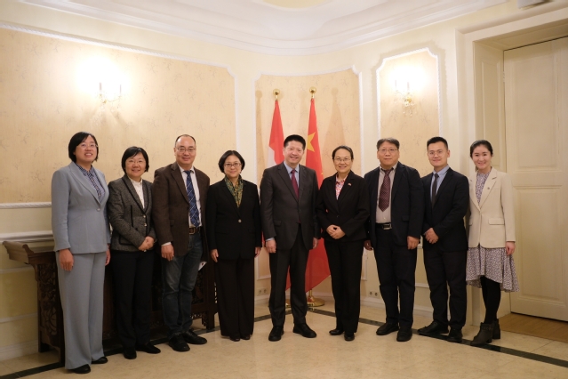 10月12日,裘新一行拜會中國駐奧地利大使館,會見大使亓玫及教育事務負責人黃崇嶺。雙方就中奧高等教育發展與挑戰進行深入交流,共同表達了大力推進中奧高等教育人員互訪與學術交流的愿景。10月15日,裘新一行拜會中國駐盧森堡大使館,會見代辦王原參贊。雙方就中盧高等教育交流現狀進行探討,進一步推動中盧文化交流。
