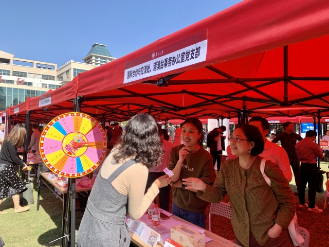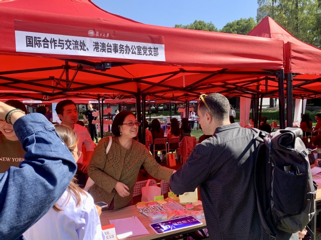參與服務的黨員早早地來到現場,為師生準備了詳細的業務指南、介紹資料、聯絡方式等,同時準備了趣味問答游戲和精美紀念品?;顒蝇F場氣氛熱烈,共有百余名師生來到了國合處與港澳臺辦的攤位。參與師生駐足掃碼關注國合處和港澳臺辦微信公眾號,對日常業務辦理提出咨詢、意見和建議,熱情參與了趣味問答游戲。
